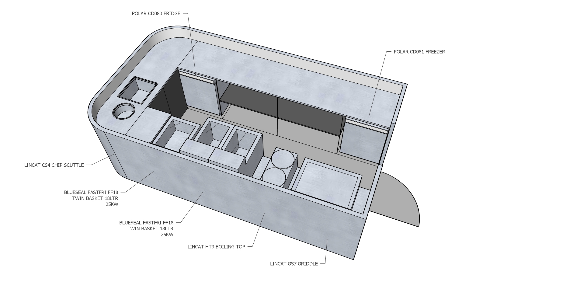 For Fancy Fries, we delivered a complete internal and external fit-out, creating a kitchen that’s as practical as it is professional. Inside, non-slip flooring, light weight aluminium finishes, and integrated storage were all crafted from high quality materials, chosen with hygiene and durability in mind. The setup features commercial fryers, fully fitted plumbing, and electrics – all installed to suit the bespoke layout and meet the latest safety standards. Externally, we added custom cladding, serving hatches, lighting, and branded panels to ensure the trailer looks as good as it performs.